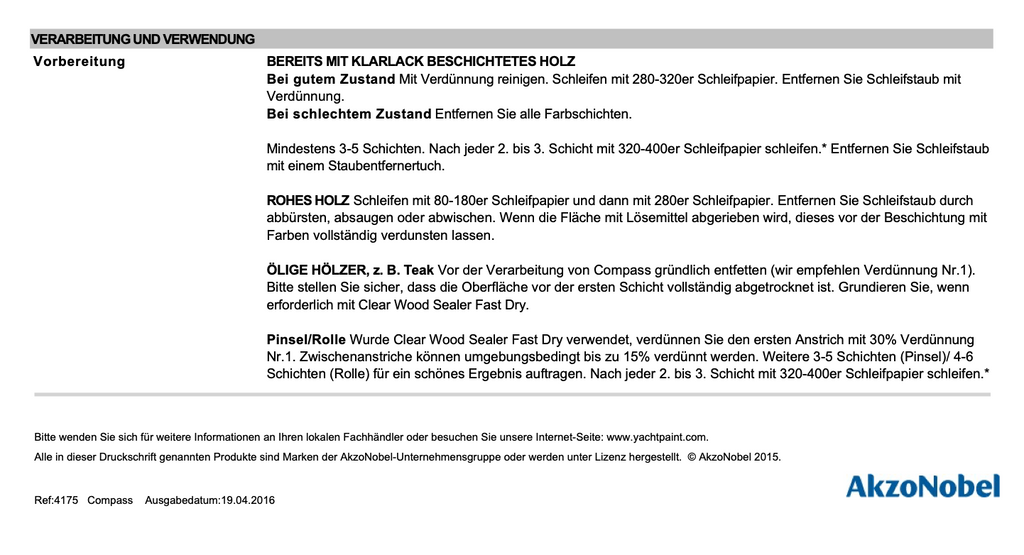 Compass Klarlack ist ein Alleskönner. Er ist schnell trocknend, strapazierfähig, haltbar, kratzfest und widersteht Abrieb, Öl, milden Säuren und Laugen sowie Alkoholspritzern.