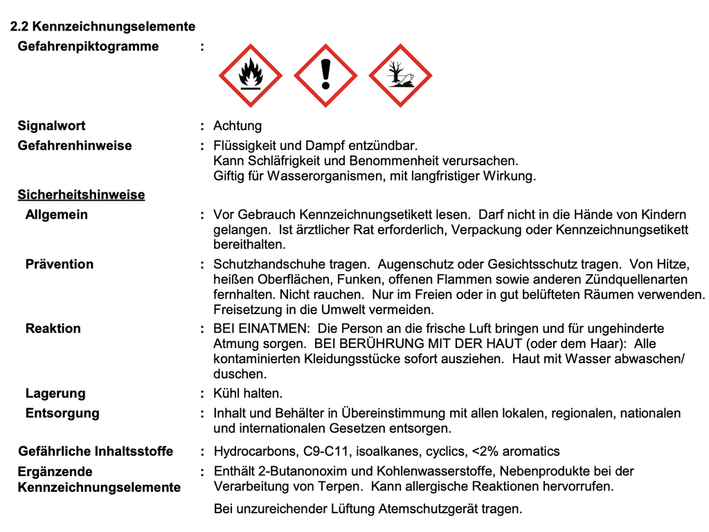 Das Sicherheitsdatenblatt enthält detaillierte Angaben für die aktuelle Rezeptur dieses Produkts wie gefährliche Bestandteile, Erste-Hilfe-Maßnahmen, Maßnahmen zur Brandbekämpfung, Handhabung und Lagerung.