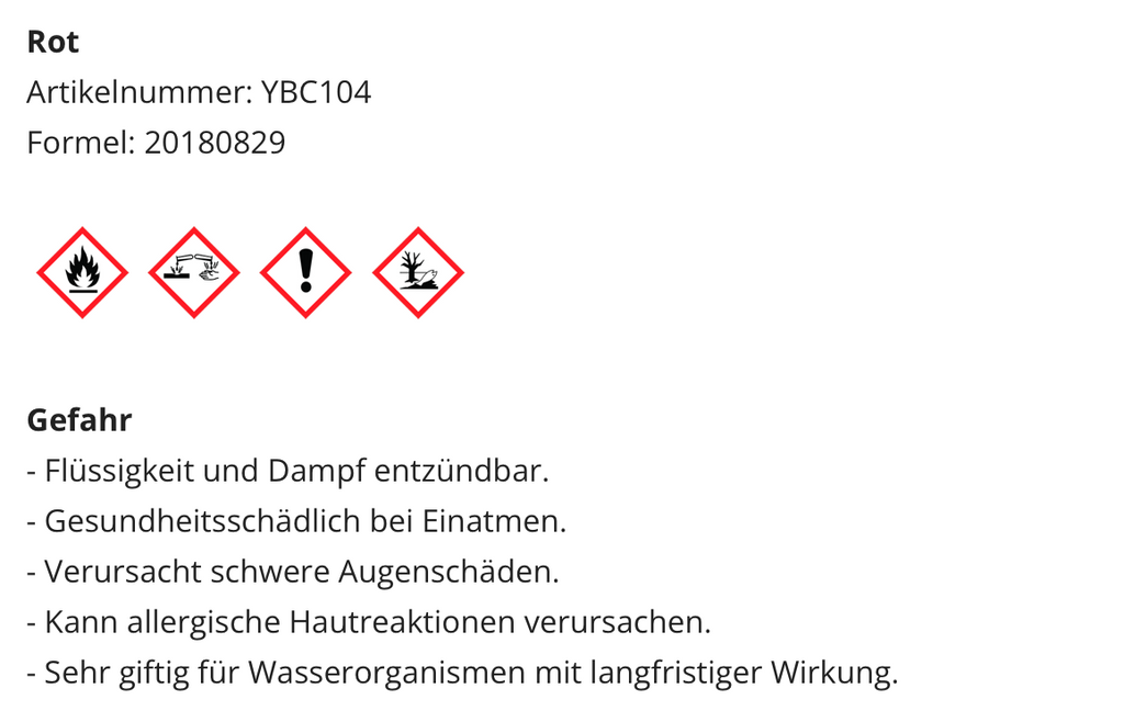Das Sicherheitsdatenblatt enthält detaillierte Angaben für die aktuelle Rezeptur dieses Produkts wie gefährliche Bestandteile, Erste-Hilfe-Maßnahmen, Maßnahmen zur Brandbekämpfung, Handhabung und Lagerung.