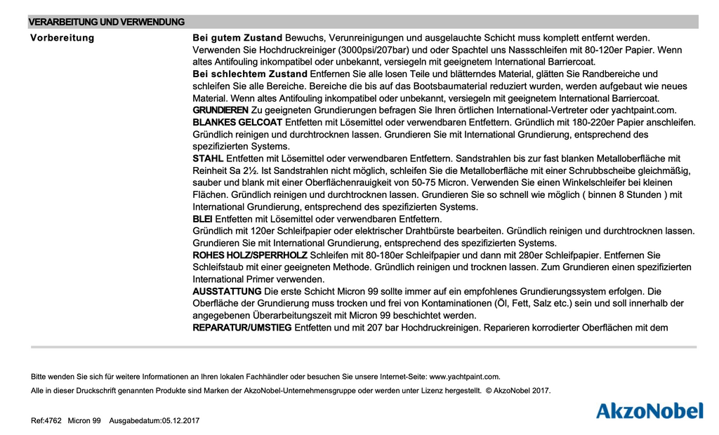 Gilt für die folgenden Inhaltsstoffen: Isothiazolinon (DCOIT), Dichlofluanid, Kupferflocken, Dikupferoxid, Kupferpyrithion, Kupferthiocyanat, Tolylfluanid, Tralopyril & Zineb.