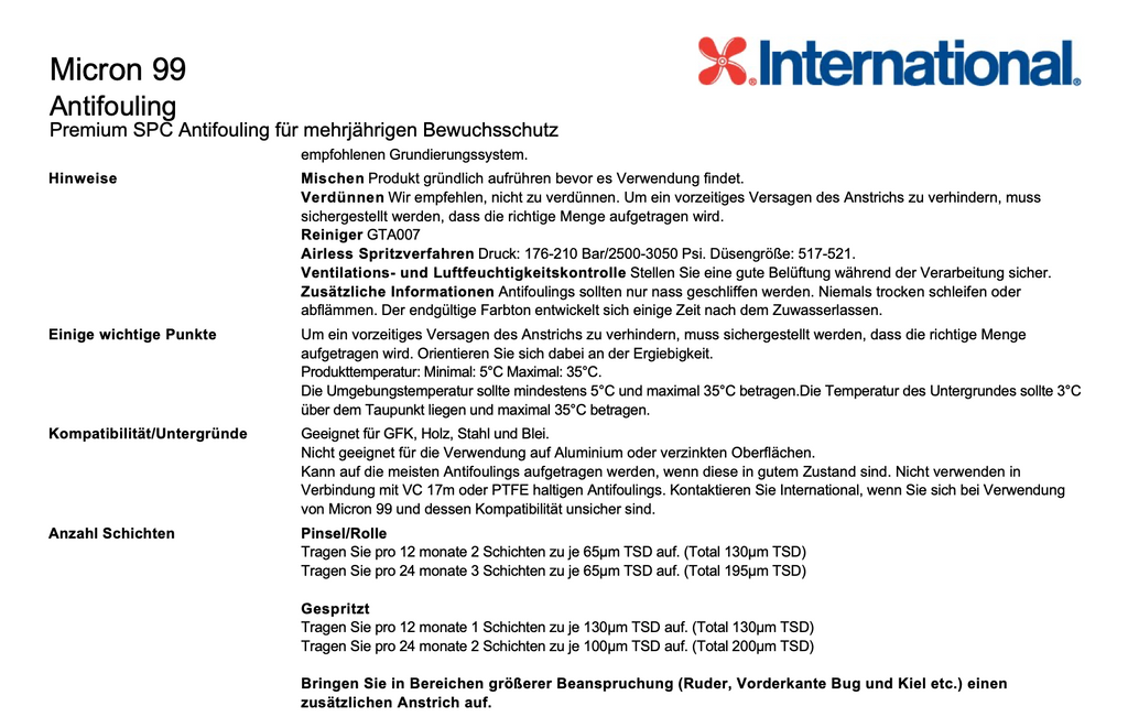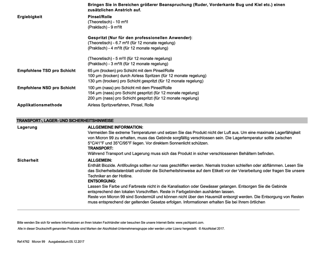 Micron 99 wurde entwickelt, um Ihnen einen starken Antifouling-Schutz vor Schleim, Algen und tierischem Bewuchs zu bieten.Es ist ein Self Polishing Copolymer (SPC) für den mehrjährigen Einsatz und kann daher im Laufe der Zeit Treibstoffeffizienz und Geschwindigkeit erhöhen.