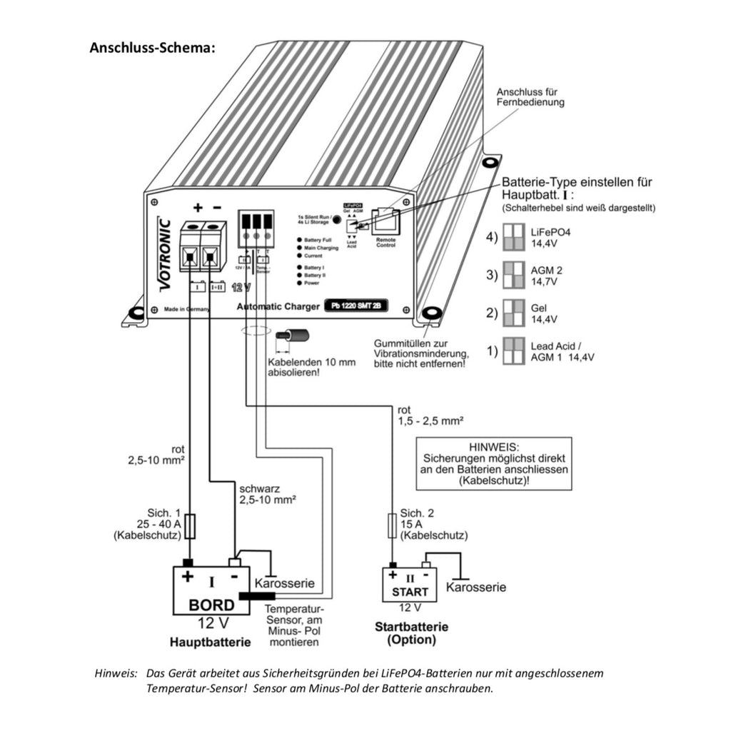 The automatic charger Pb 1215 SMT 2B from Votronic (MPN 3100) is a modern battery charger for mobile use. It has charging programs for GEL, AGM, acid and modern lithium batteries and is designed for 12V battery voltage. The charging current at the main output is 15A. In addition, there is an auxiliary charging output for the starter battery, which can supply an additional 2A charging current. The device is suitable for batteries with a capacity of 38Ah to 170Ah.