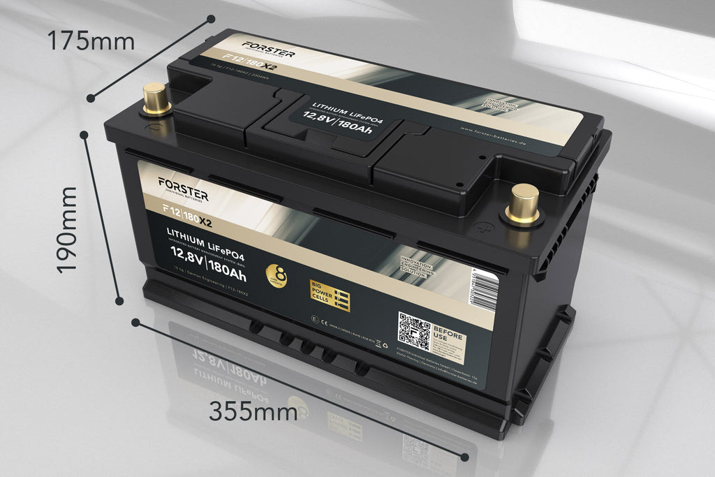 FORSTER 180Ah 12,8V Lithium LiFePO4 Premium Batterie | 200A-BMS-2.1 | 2304Wh | IP67 I 500A Bluetooth Mess-Shunt
